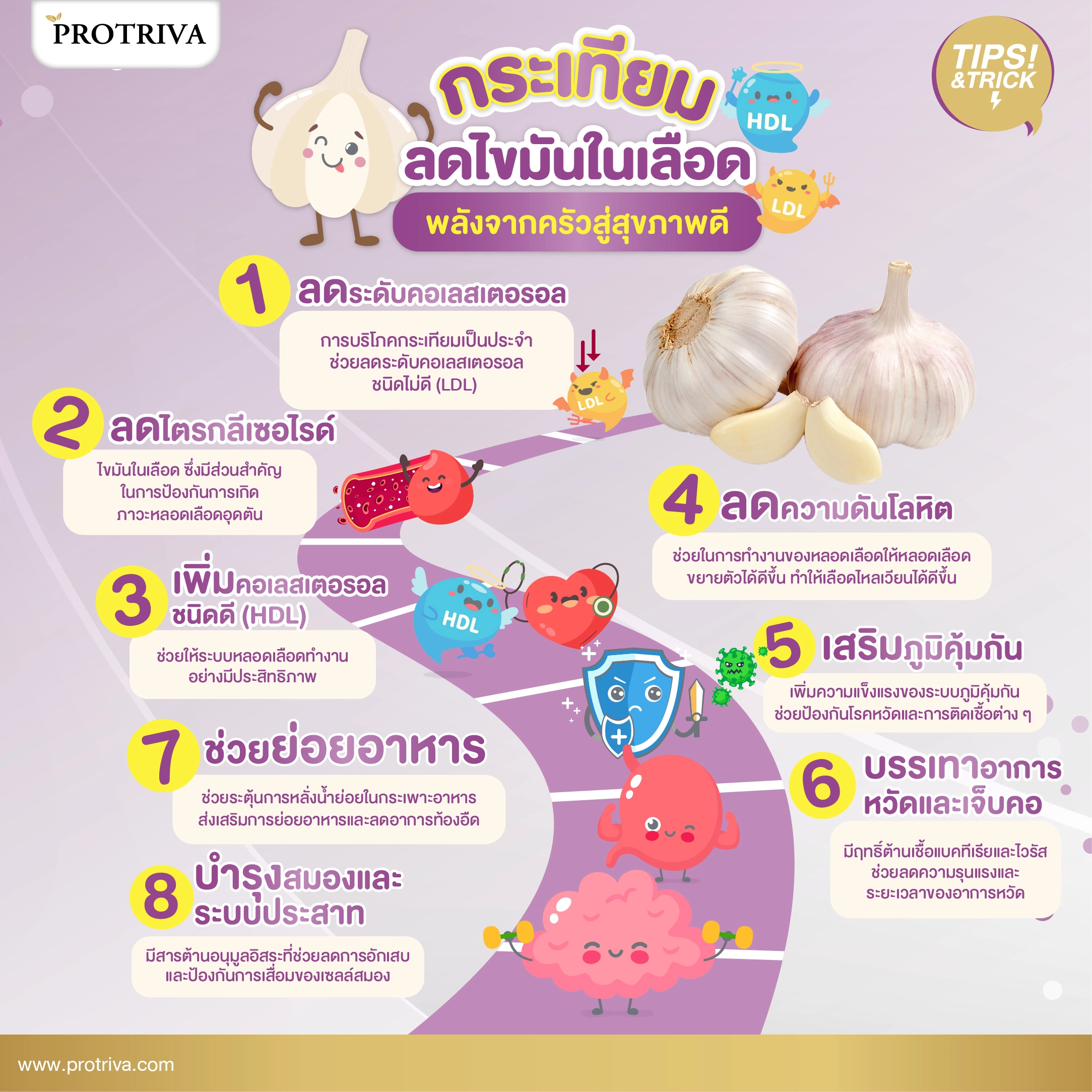 นอกจากจะช่วยลด LDL แล้ว กระเทียมยังมีผลดีต่อการลดไตรกลีเซอไรด์ ซึ่งเป็นไขมันในเลือดที่มาจากการบริโภคอาหารประเภทไขมันและน้ำตาลมากเกินไป การลดระดับไตรกลีเซอไรด์มีส่วนสำคัญในการป้องกันการเกิดภาวะหลอดเลือดอุดตัน